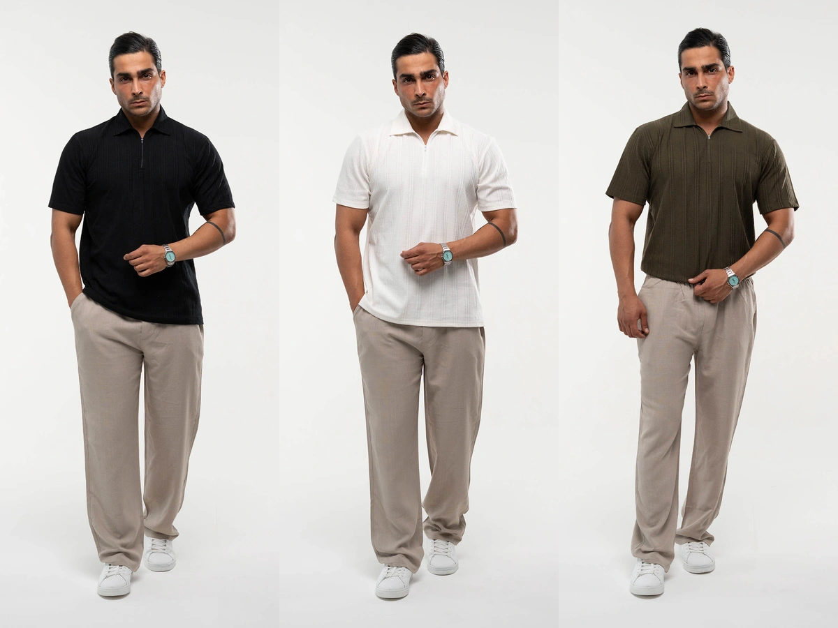 تیشرت نیم زیپ مردانه یقه ایستاده مراکش ۱۰۰٪ پنبه‌ای (سفید مشکی زیتونی)