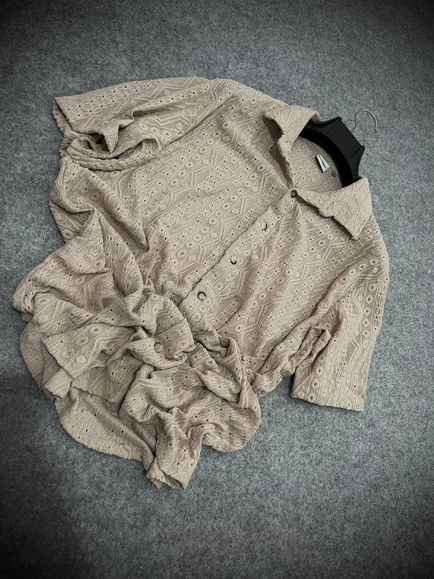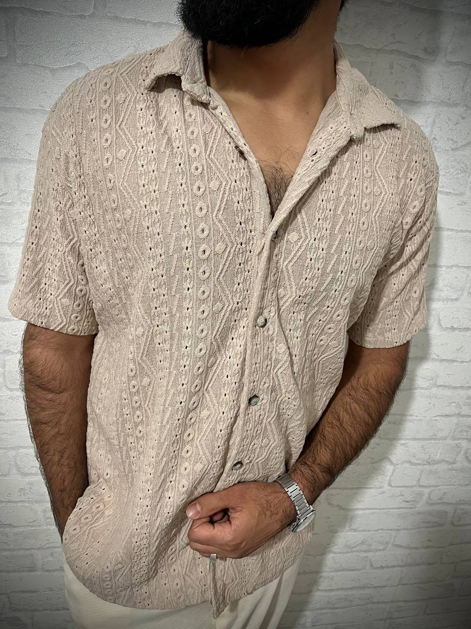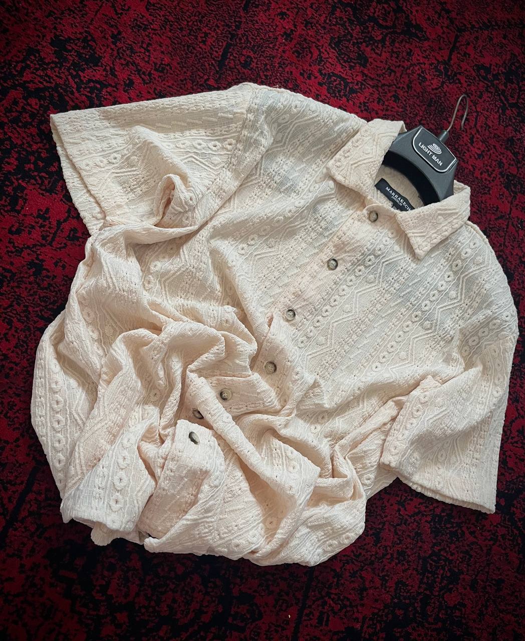 پیراهن کرم با پارچه بافتدار طرحدار (ایلت/ژاکارد ظریف)، سبک و خوشتن برای استایل تابستانی و روزمره. یقه کلاسیک، دکمهدار و فیت راحت؛ بهخوبی با شلوار کتان و جین ست میشود.