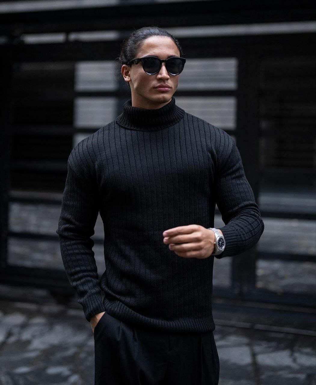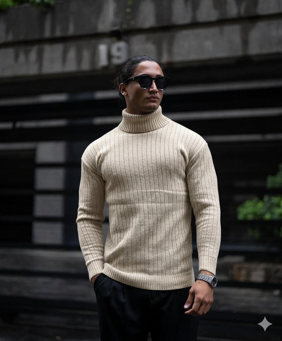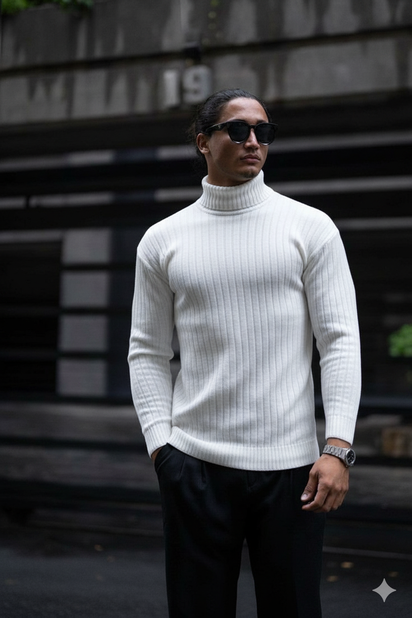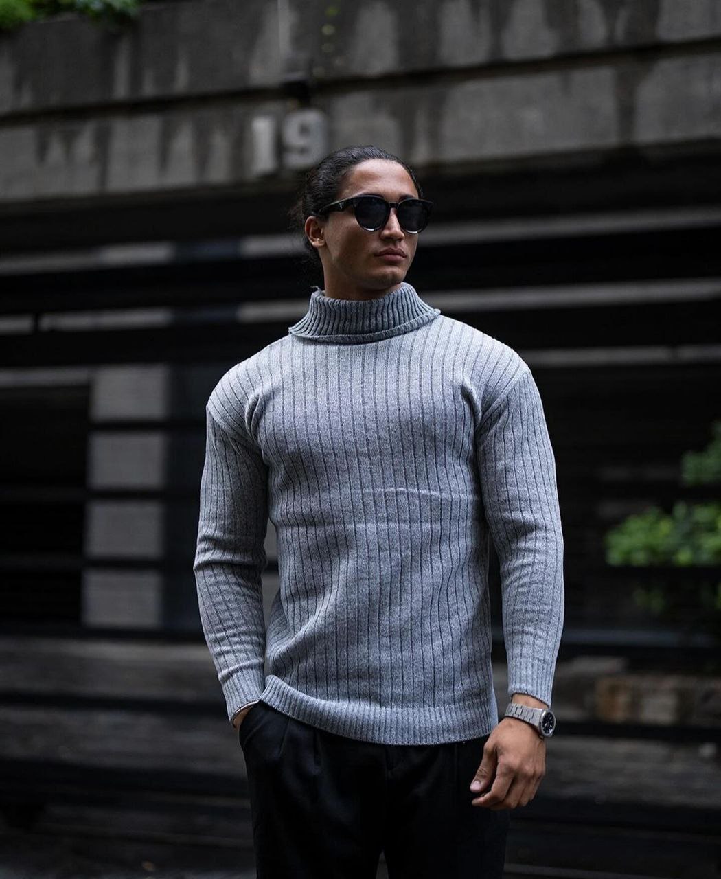 این بافت مردانه با یقه اسکی کلاسیک و بافت میلهای خاص، ترکیبی از استایل مینیمال و جذابیت زمستانی را ارائه میدهد.