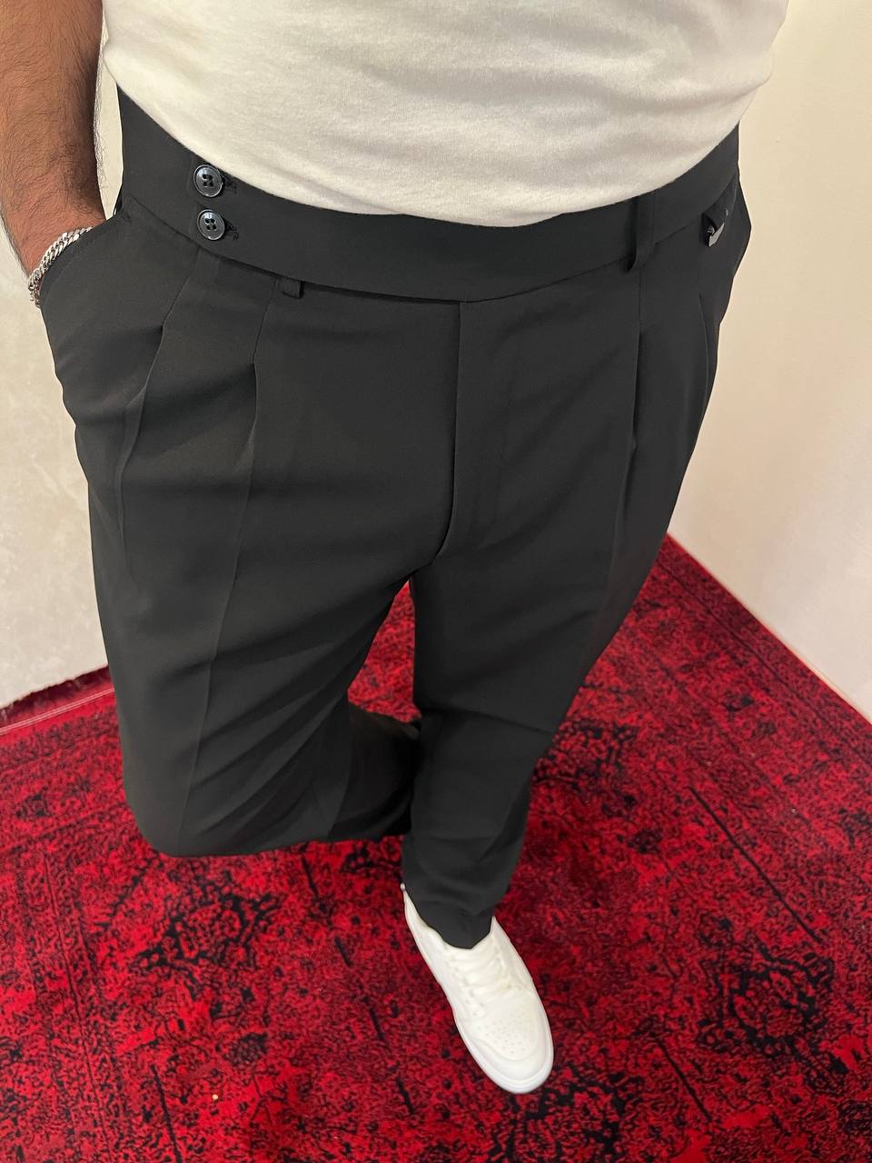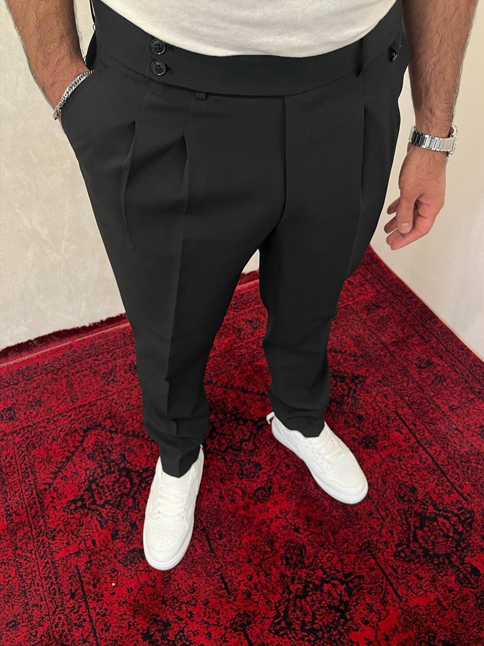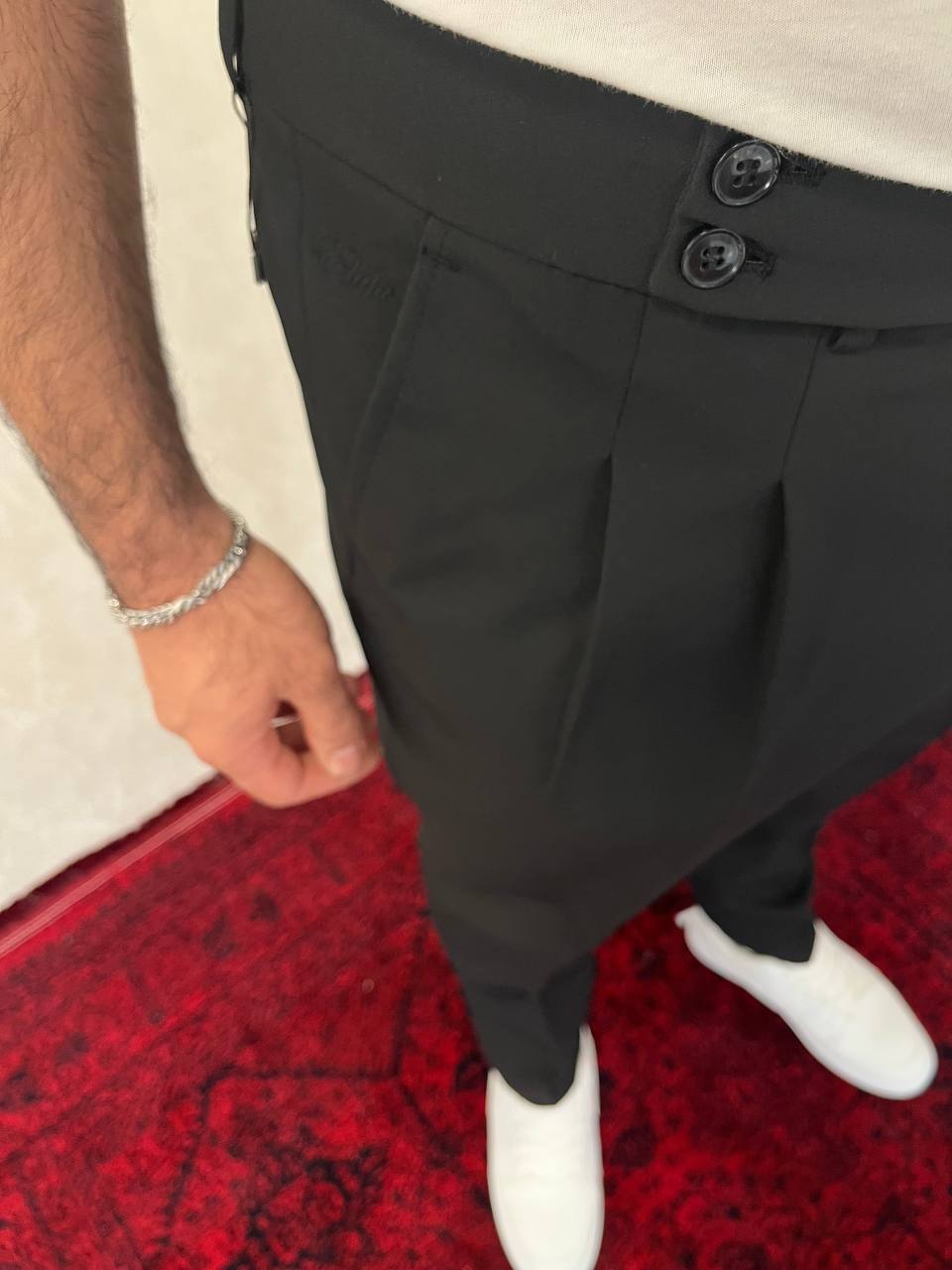 این شلوار با طراحی کمر ایتالیایی و دو دکمه کناری، ظاهری خاص و مجلسی دارد.