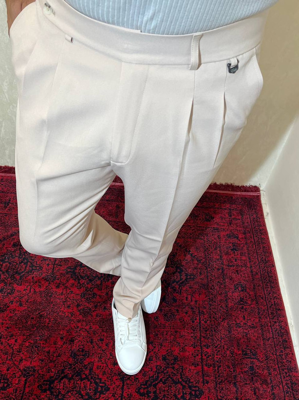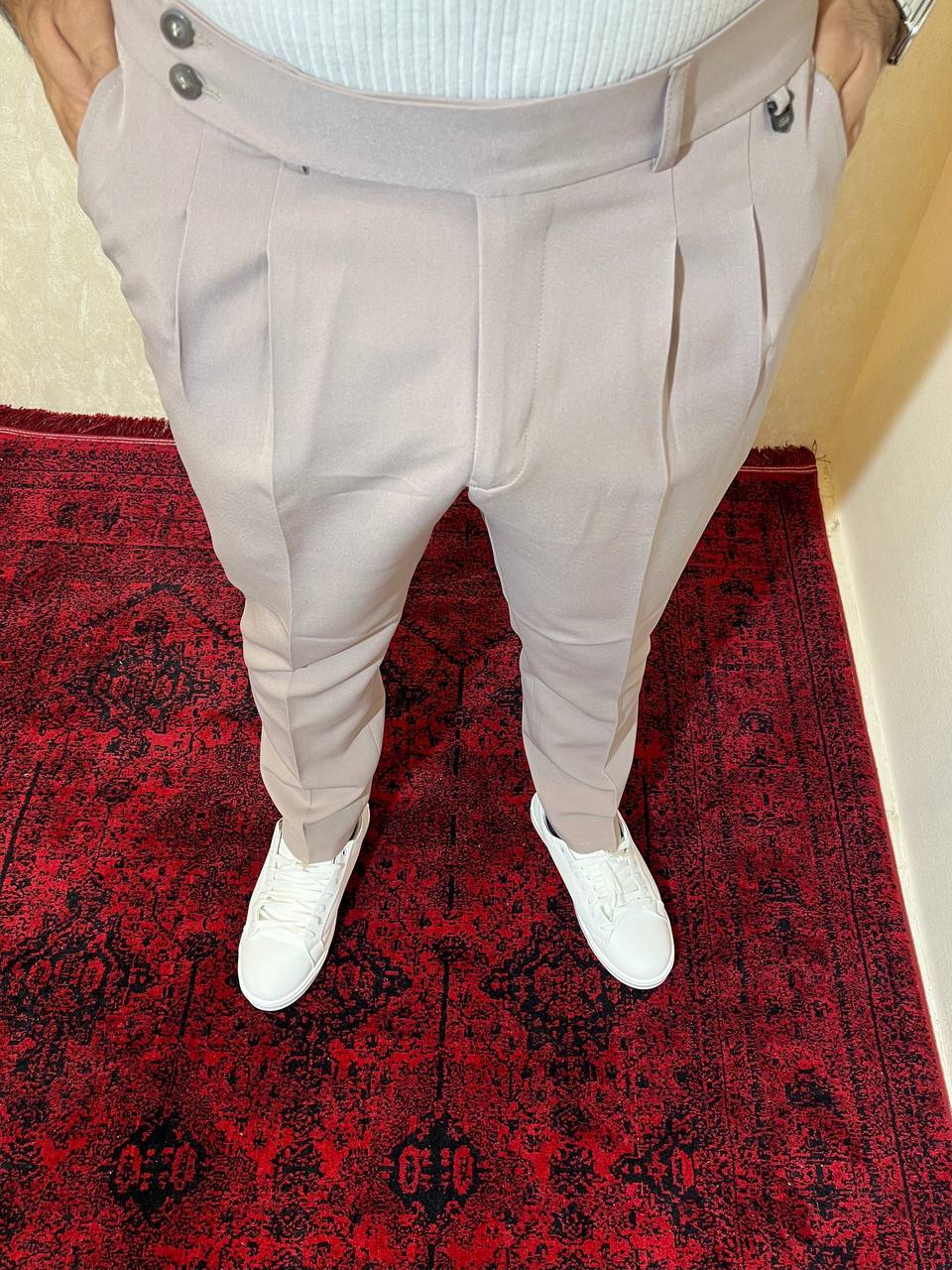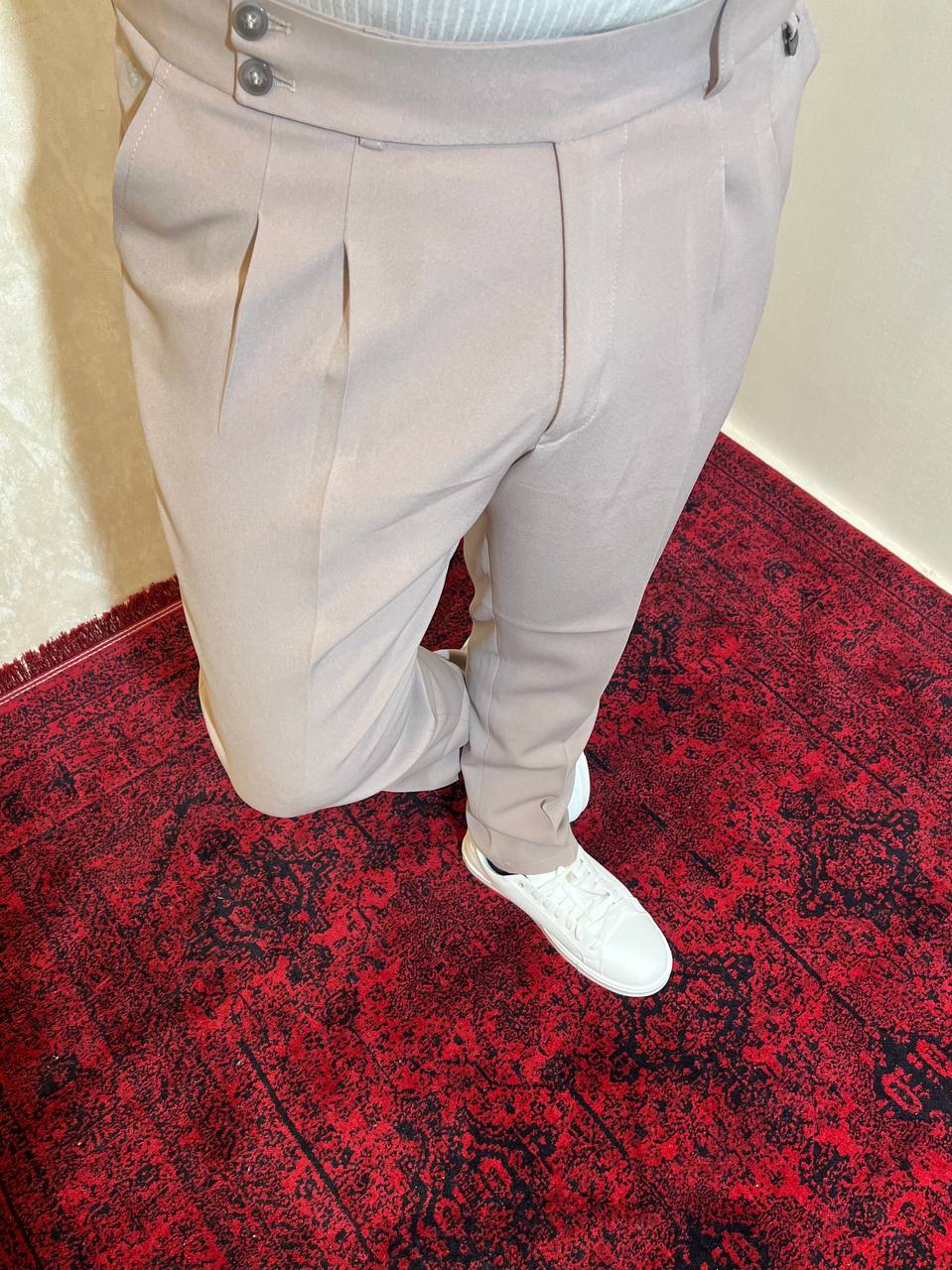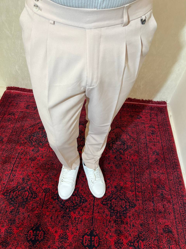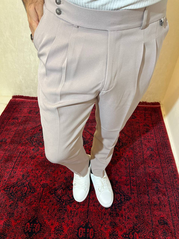 این شلوار با طراحی کمر ایتالیایی و دو دکمه کناری، ظاهری خاص و مجلسی دارد.