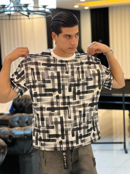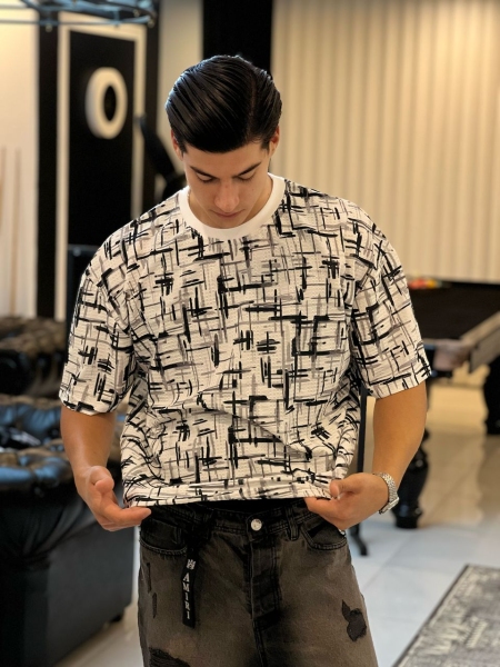 تیشرت مردانه بوکله چاپی تابستانی با پارچه مراکشی و طرح مدرن در رنگ‌های مشکی، آبی و سفید مناسب استایل کژوال